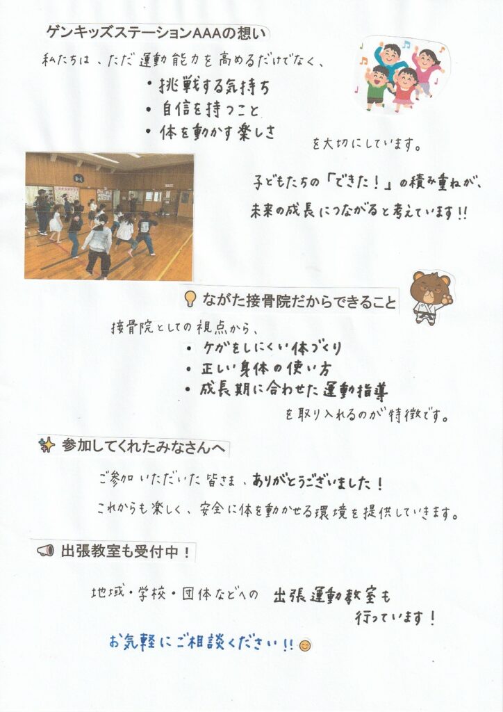 今回はながた接骨院の院長が行っている、子供たちの身体を愉しく育成するプロジェクト、ゲンキッズステーションAAAの出張運動教室の様子をお伝えします。