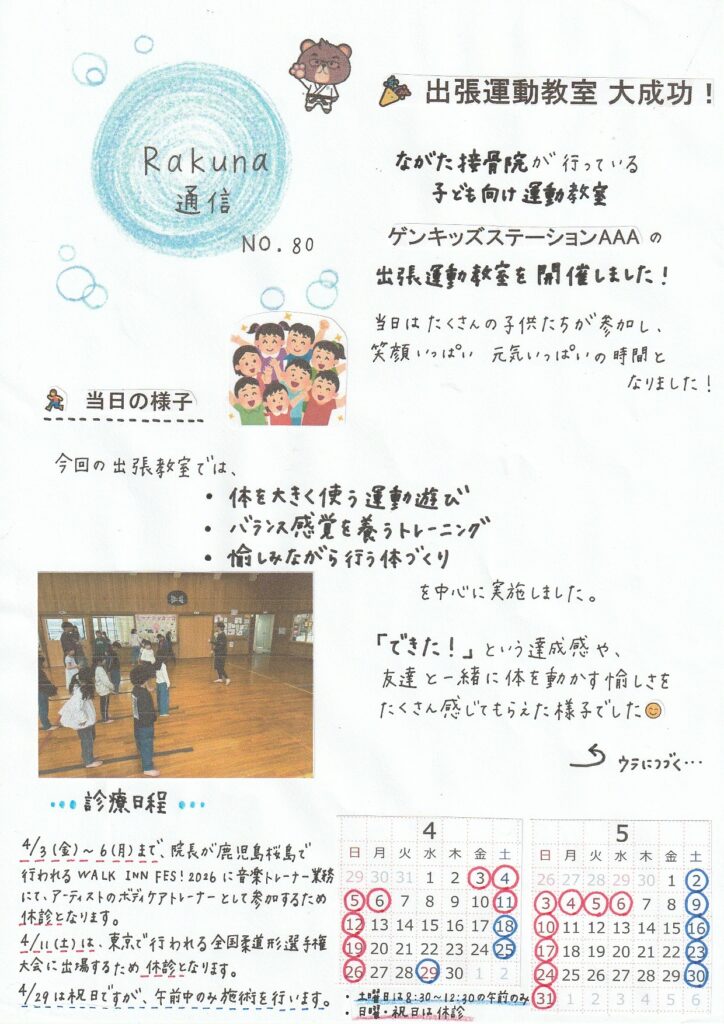 今回はながた接骨院の院長が行っている、子供たちの身体を愉しく育成するプロジェクト、ゲンキッズステーションAAAの出張運動教室の様子をお伝えします。